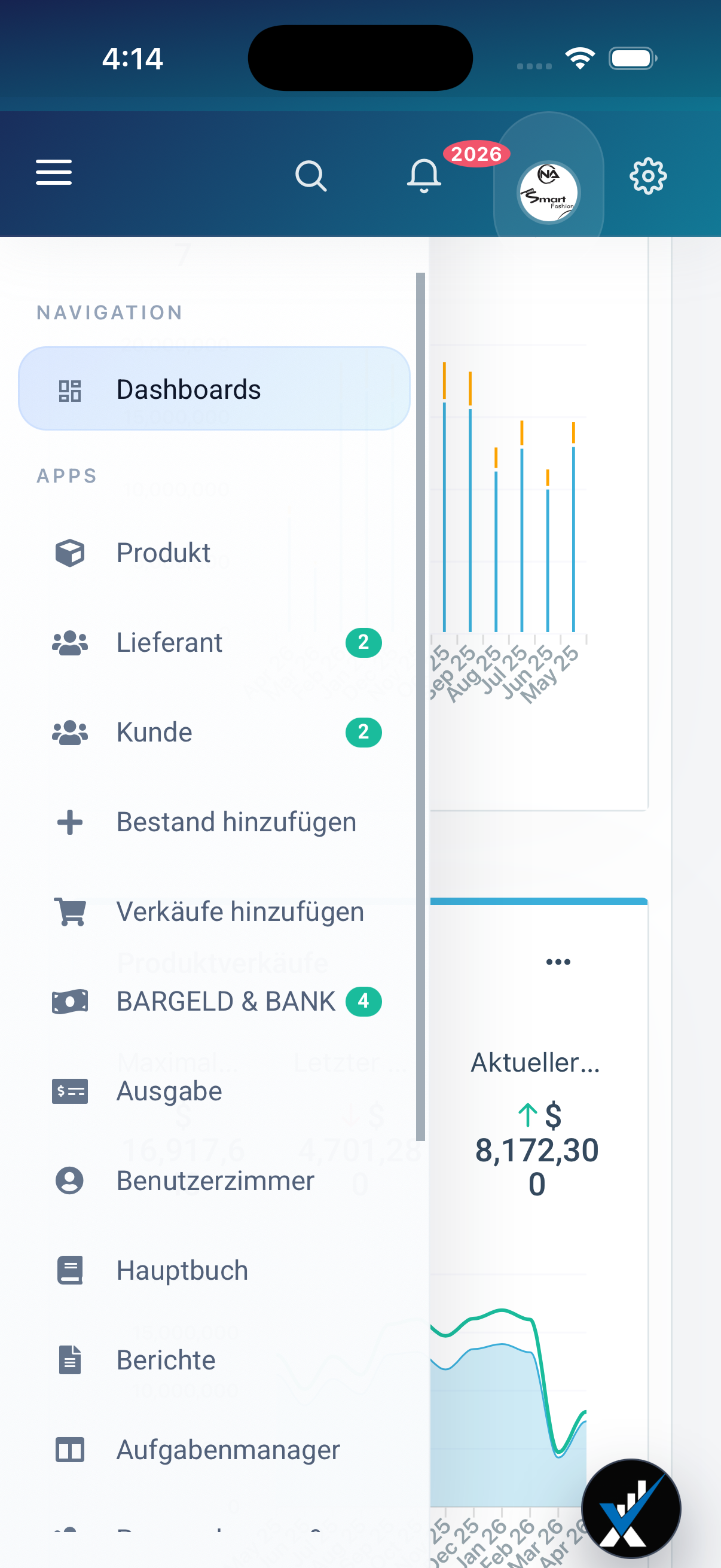 Inhaber sehen Salden, Gewinn, Aging, Payroll, KI-Zusammenfassungen und operative Nachverfolgung ohne neue Tabellen.